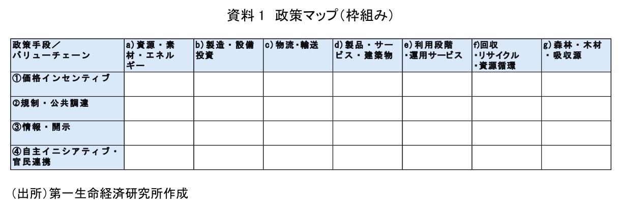 こうして設定した縦軸と横軸を組み合わせると、次のような「政策マップ」の枠組みを作成できる(資料1)。