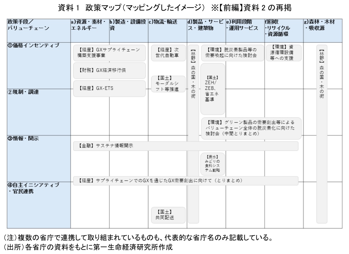【前編】では、GX需要創出を考える前提として、次の3点を整理した。まず、GX価値について、脱炭素だけでなく、資源循環性、自然共生、レジリエンス、トレーサビリティ・透明性の要素を含む概念として定義した。次に、「GX製品等は高くて選ばれにくい」という直感を三つの価格パターンと非価格要因に分けて捉え直した。そして、複数省庁のGX関連施策を、「政策手段×バリューチェーン」のマップとして政策マップ(資料1)として可視化することの有用性を示した。