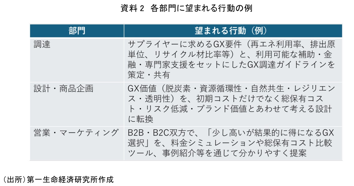 大企業には、政策マップ(政策手段×バリューチェーン)に自社グループとサプライチェーンを重ね、どの段階でどの政策・支援が使えるかを把握した上で、GXリーグやGX率先実行宣言、GX-ETS(排出量取引制度)等を、経営・調達・設計・営業・財務をまたぐ統合的なGX戦略として位置づけていくことが一つの方向性と考えられる。調達・設計・営業など各部門が、「GXはコスト要因」ではなく「新たなビジネス機会」であるという前提で、自部門なりのGX貢献を具体化していくことが重要である(資料2)。