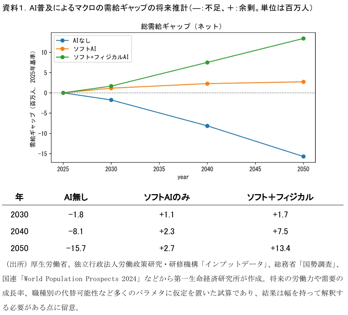 推計の結果、AI普及が進まない場合は人口減少により2050年に約1,570万人相当の労働力不足(2025年比)が見込まれる。AI普及が進めば、ソフトウェアAIのみでも需給は余剰化。ソフト+フィジカルAIが普及すると2050年時点で約1,340万人の余剰が生じる。