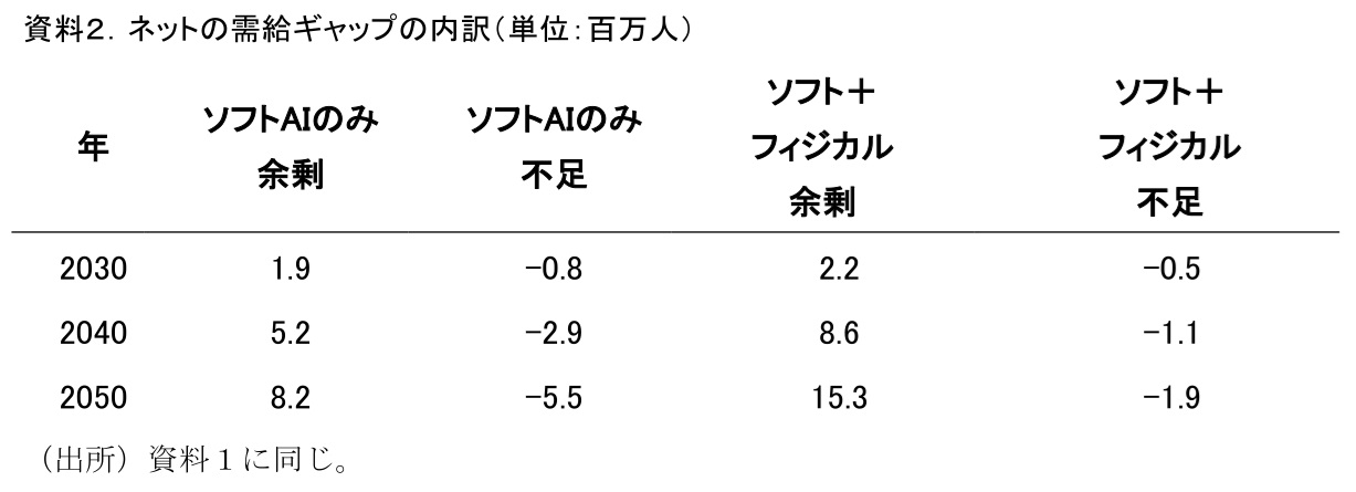 ネットの需給ギャップからは、AIの普及が人手不足経済を人手余剰経済に転換する姿が描かれる。しかし、ネットでは余剰状態でも職種別には余剰と不足が同時に存在し、その規模は年とともに拡大する。資料2(7ページ参照)では各職種の余剰・不足数を用いて、相殺する前の余剰数と不足数を示した。例えば、2050年のソフトウェアAIシナリオでは、820万人の余剰と550万人の不足が同時に発生している。