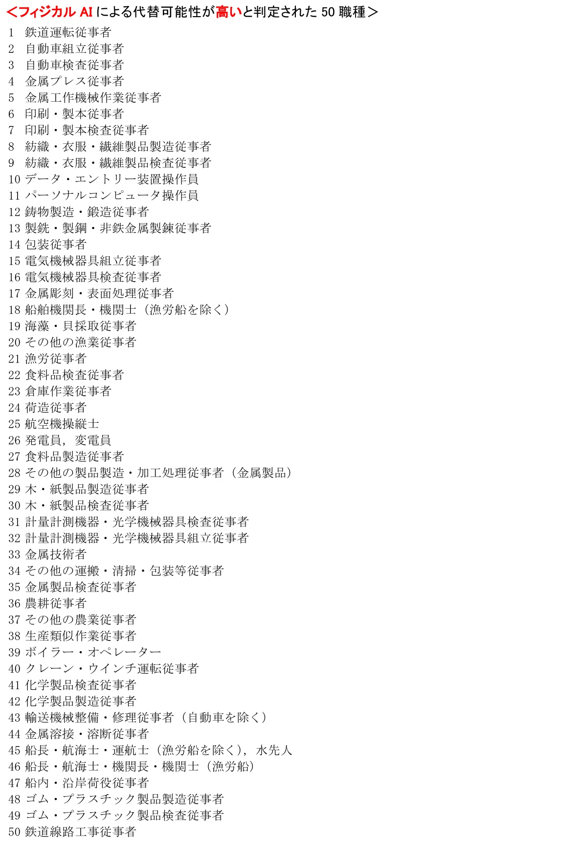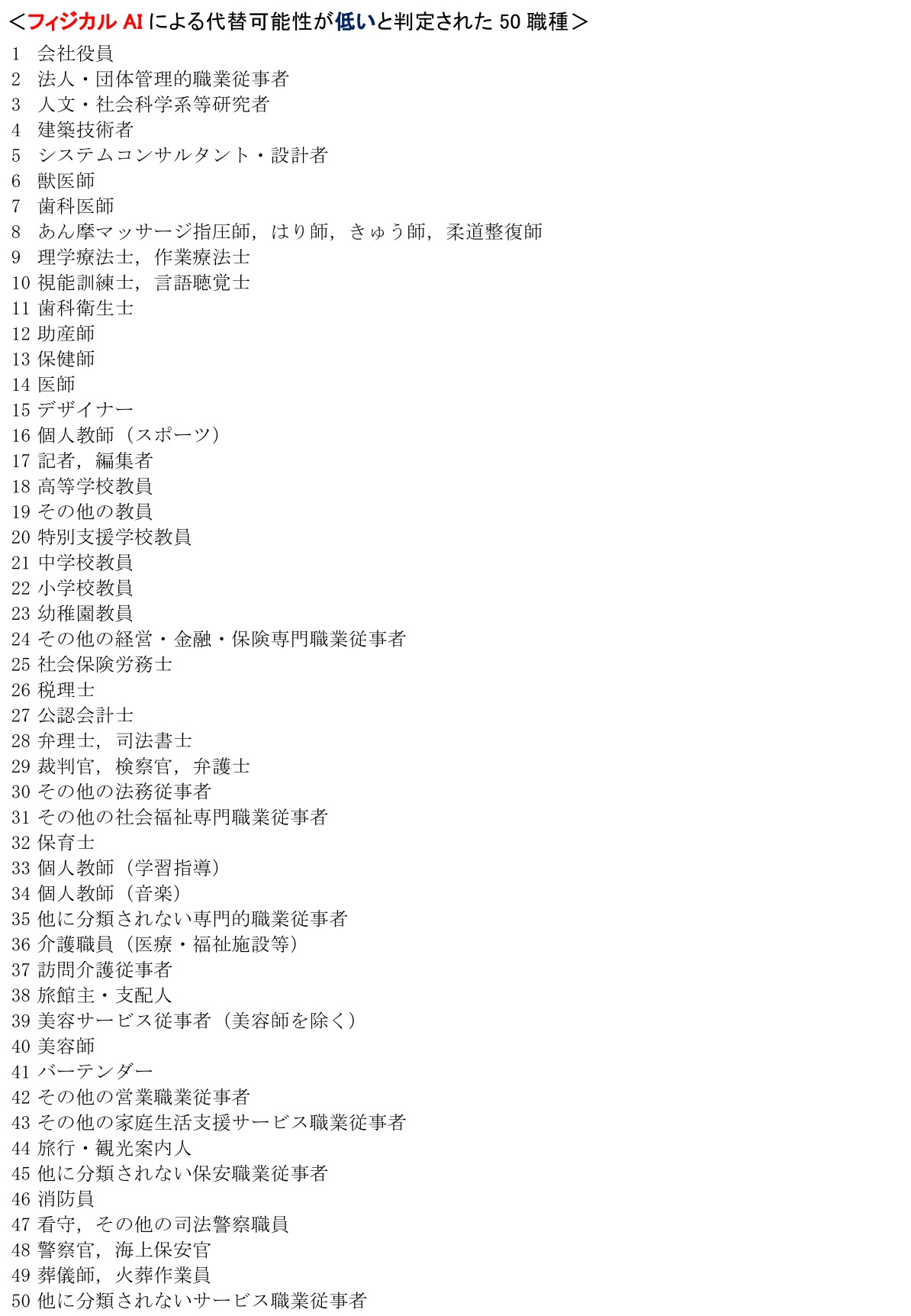 一方で、フィジカルAIの推計でも示したように、物理的な定型的作業の仕事はフィジカルAIの技術に徐々に代替されていくことも予想される未来の一つである。単にホワイトカラー対ブルーカラーの構図にはならないともいえよう。ブルーカラー系の職種でも、定型性が高いものか、対人性が伴うか等の要素によってフィジカルAIへの代替性は異なってくると見込まれる。