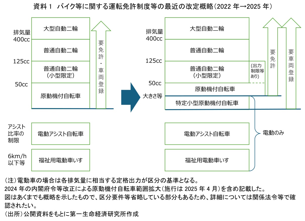 個人用移動手段の普及には、運転免許制度等の改定が一役買っている(資料1)。従来は電動も含めて、自動二輪(排気量50cc超相当)、原動機付自転車(排気量50cc以下相当)といった免許が必要なものと、電動アシスト自転車(自転車扱い)や福祉用電動車いす(歩行者扱い)のような免許が不要なものに分かれていた。これが2022年の道路交通法等の改正(施行は2023年)により、自転車同様の軽車両扱いで運転免許不要の「特定小型原動機付自転車」(以下「特定原付」)という区分が新設され、最高速度や大きさ等の条件を満たす電動キックボード等はそちらに分類されるようになった(ただし車両登録や自賠責保険への加入は必要)(資料1)。