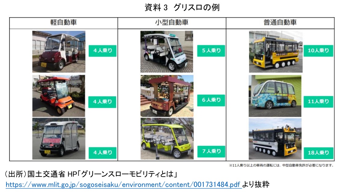 国土交通省ではグリスロをコミュニティバスよりも短い、自宅からバス停までの移動等に用いるものとしているが、グリスロとされる車両がコミュニティバス的に使われることもあることから、本レポートではコミュニティバスに使われているものも含めグリスロと呼ぶこととする。