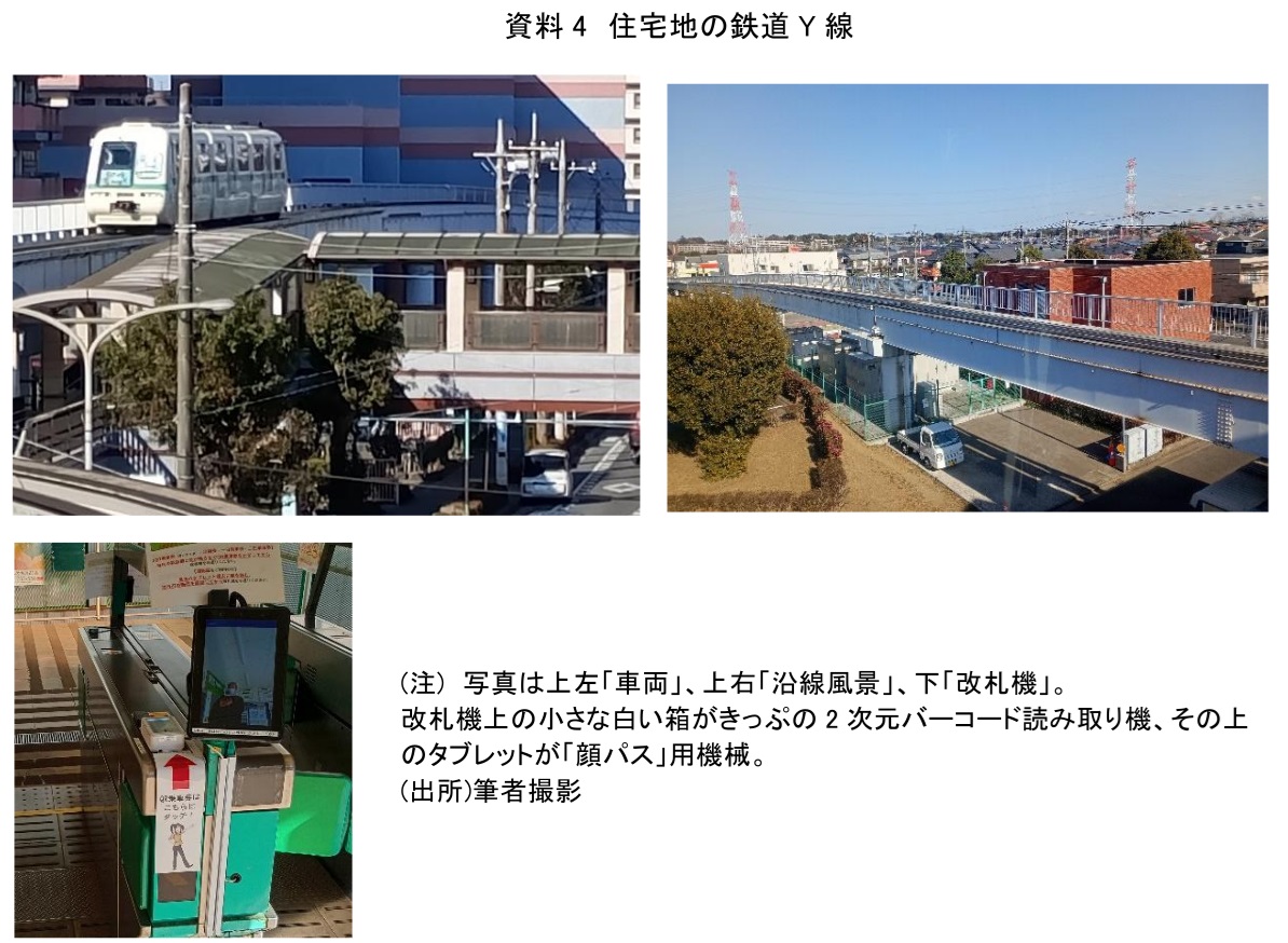 鉄道単独で見ると赤字のため、いろいろな所で節約が行われている。ユーザー層を考えてか、鉄道系ICカードは使用できない。一方で、磁気きっぷ(注2)を廃止して2次元バーコード搭載のきっぷに切り替えたり、顔認証決済(いわゆる顔パス)を導入したりと、ミニ鉄道であることを活かし、新しいことを導入している(資料4下段改札の写真参照)。そして、3両編成の電車を昼間でも20分間隔で運転している。
