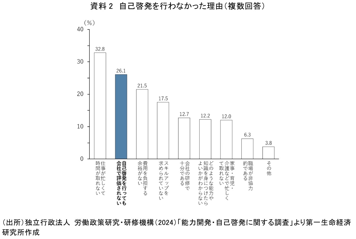 独立行政法人 労働政策研究・研修機構(JILPT)が2024年に実施した調査では、自己啓発を実施しなかった理由として「仕事が忙しくて時間が取れない(32.8%)」に次いで、「自己啓発を行っても会社で評価されない(26.1%)」が上位に挙げられている(資料2)。