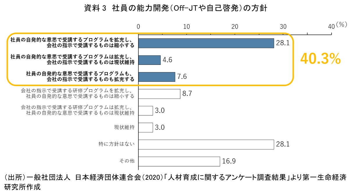 こうした方向性のもと、企業側でも能力開発を「会社が割り当てる研修」から「本人が選ぶ学び」へ寄せる運用がみられる。一般社団法人 日本経済団体連合会(2020)によると、約4割の企業が社員の能力開発において「社員の自発的な意思で受講するプログラムを拡充する」と回答している。