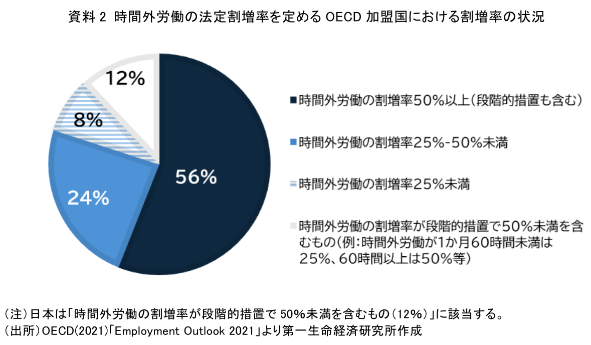 時間外労働の割増率を法令で定めているOECD加盟国のうち、約6割が50%以上の割増率を設定しており、日本の割増率は国際的にみて比較的低い水準にあるとの指摘もあります(資料2)。