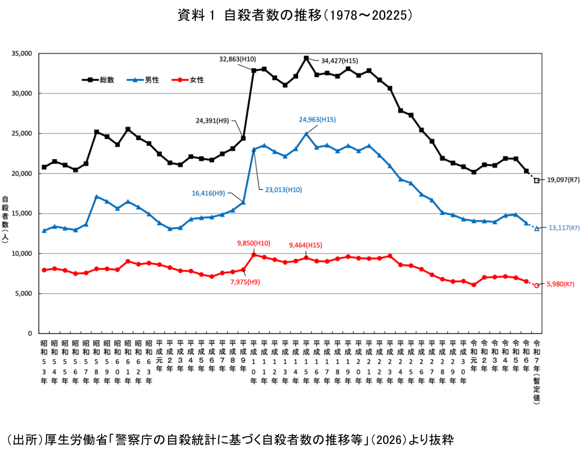 2025年の自殺者数は19,097人(暫定値)と統計開始以来、初めて2万人を下回る一方、小中高生の自殺者数は過去最多となり(厚生労働省, 2026)、若年層の自殺(自死)問題が依然として重要な社会課題であることを示している。