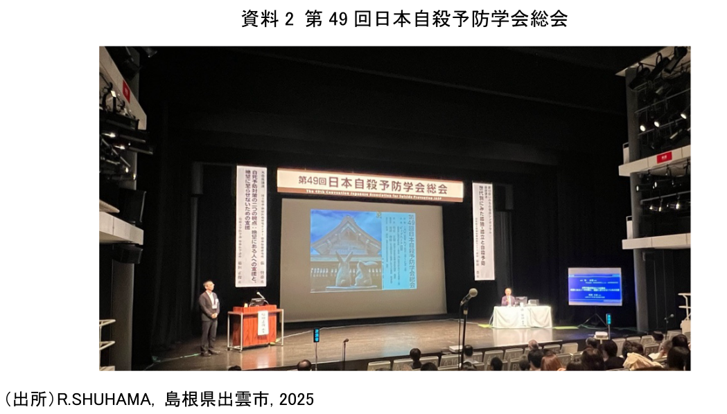 我が国の自殺予防を目的に精神科医や心理学者が中心となり1970年に発足した「自殺予防研究会」は、1981年に「日本自殺予防学会」と名称変更し、2017年には法人化し、一般社団法人日本自殺予防学会として活動を続けている(JASP, n.d.)。2025年9月には、本稿を監修する国立大学法人島根大学医学部精神医学講座の稲垣正俊教授を大会長に、島根県出雲市にて第49回日本自殺予防学会総会が開催され(JASP, 2025)、筆者も学会員として参加した(資料2)。第49回大会テーマは「広がる生きづらさに向き合う:自殺予防における効果的アプローチの実現へ」であり、2023年から島根大学医学部に「第一生命メンタルヘルスケア共同研究講座」を設置して(第一生命グループ, 2023)、メンタルヘルス分野の社会課題解決に貢献する研究に取り組んでいる第一生命ホールディングス株式会社が、生命保険会社として初めて本学会を協賛し、自殺予防は政策、学術、医療分野だけでなく、社会全体での理解、協力体制が必要であることを示した。