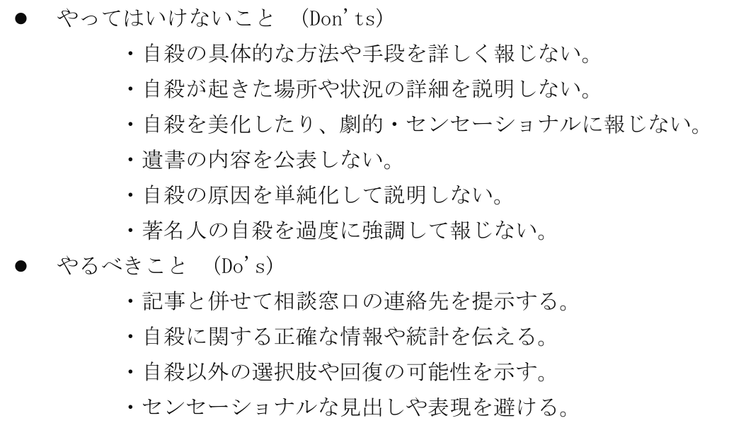 報道領域では、まず強調すべきなのは、主要な指針が表記統一よりも報道のあり方そのものに重点を置いている点である。国際的な標準となるWHOの自殺報道ガイドライン2023年版(初版2000年)では、以下の点が重視されている(WHO, 2023):