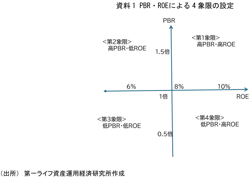 本稿における4象限は、PBR1倍およびROE8%を基準として設定した。すなわち、第1象限は高PBR・高ROE、第2象限は高PBR・低ROE、第3象限は低PBR・低ROE、第4象限は低PBR・高ROEの企業群である(資料1)。これは、市場評価と収益性の組み合わせから企業群の特徴を簡潔に把握するための整理である。
