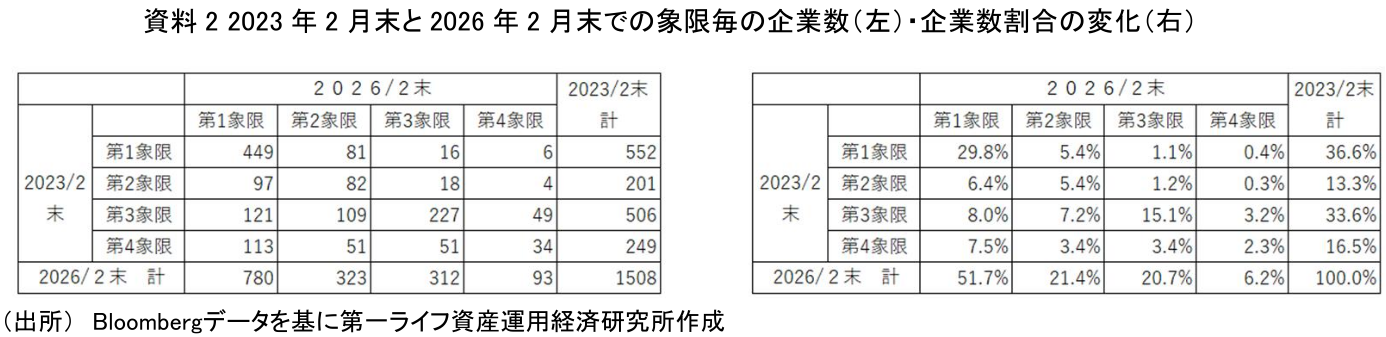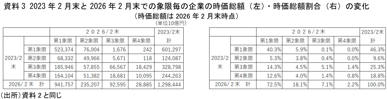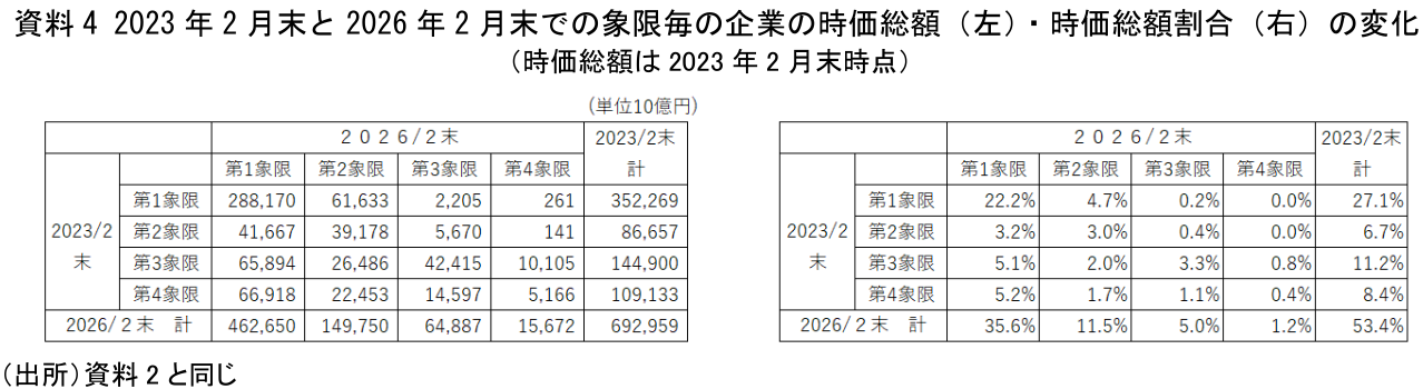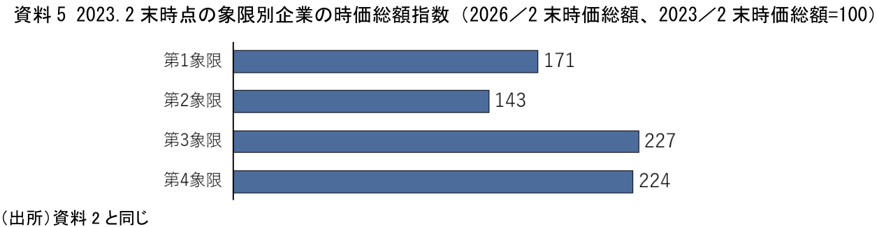 2023年2月末を100とした2026年2月末の時価総額指数は、第1象限171、第2象限143、第3象限227、第4象限224である。すなわち、2023年時点で第3象限および第4象限に属していた企業群の時価総額の伸びが特に大きく、第2象限企業群の伸びは相対的に小さい。
