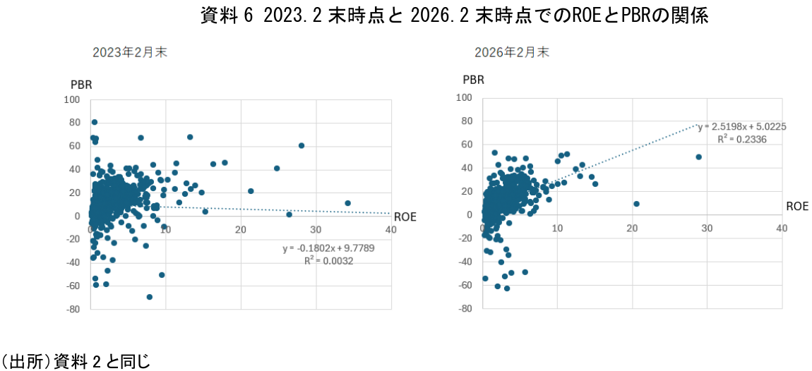最後に補論的な紹介となるが、ROEとPBRの関係そのものにも、この3年間で一定の変化がみられる。(資料6)