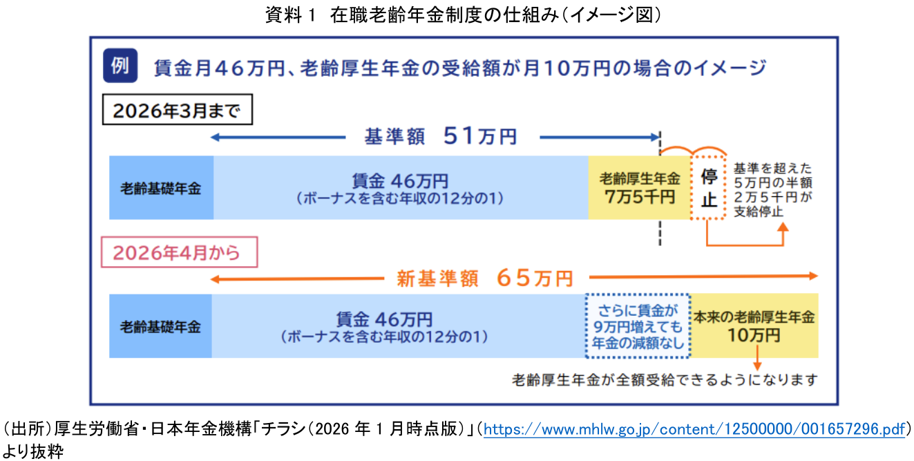 在職老齢年金制度の支給停止基準額が2026年4月から月額65万円に引き上げられた。いわゆる「年金の壁」が51万円(2025年度の基準額)から65万円に引き上げられたことで、賃金を得ながら老齢厚生年金を受け取る人にとっては朗報といえる。税や社会保険料の負担が生じることで働き控えを招くとされる「年収の壁」と並んで、働きたい高齢者にとって働けば働くほど年金額が減らされる「年金の壁」の水準が引き上げられたことは、高齢期の働き方と家計に少なからぬ影響を及ぼすと考えられる。