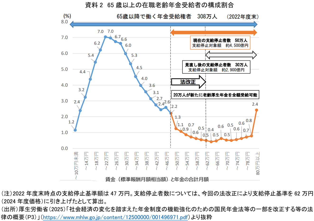 このように支給停止基準額が引き上げられるということは、年金が減額されにくくなることを意味する。厚生労働省によれば(資料2)、65歳以降で働く年金受給権者308万人(2022年度末)のうち、老齢厚生年金の支給停止者数は約50万人とされているが、今回の法改正によって、そのうち約20万人が老齢厚生年金を全額受給できる見込みだ。したがって、就業調整を行っていた高齢者にとっては「壁」を超えた就労を後押しし、既に「壁」を超えて就業していた高齢者にとっても、年金と賃金の合計に応じて程度の差はあるものの、受け取れる年金額の増加につながると考えられる。