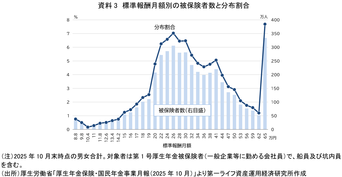 厚生労働省の統計によれば、2025年10月末現在、標準報酬月額の上限等級である65万円に該当する厚生年金被保険者の分布割合・人数がともに最も多くなっている(資料3)。上限等級に集中する、ややいびつな構造がうかがえる。この上限設定の考え方として、年金の給付額に大きな差が生じないようにする、すなわち高所得者の年金額が過大にならないようにすることに加え、保険料を折半する企業負担が過度に増えないようにすることを考慮して、標準報酬月額の平均の2倍に相当する水準に設定されている。一方で、健康保険の標準報酬月額の上限等級は139万円であり、厚生年金の上限と比較すると、その水準には大きな開きがある。