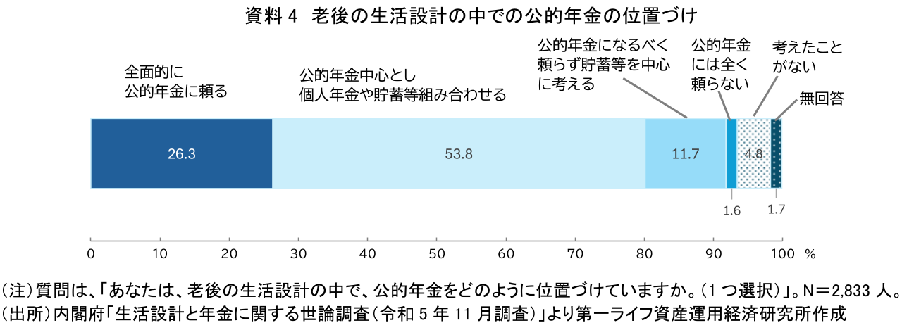 内閣府の世論調査によれば(資料4)、老後の生活設計において「全面的に公的年金に頼る」とする人は26.3%にとどまり、過半数の53.8%が「公的年金を中心とし、これに個人年金や貯蓄等を組み合わせる」と回答している。さらに、「公的年金にはなるべく頼らず、できるだけ個人年金や貯蓄等を中心に考える」「公的年金には全く頼らない」という回答も含めると、7割弱の人が公的年金への全面的な依存を避け、複数の収入源を組み合わせて老後の生活設計をしようとする姿がうかがえる。