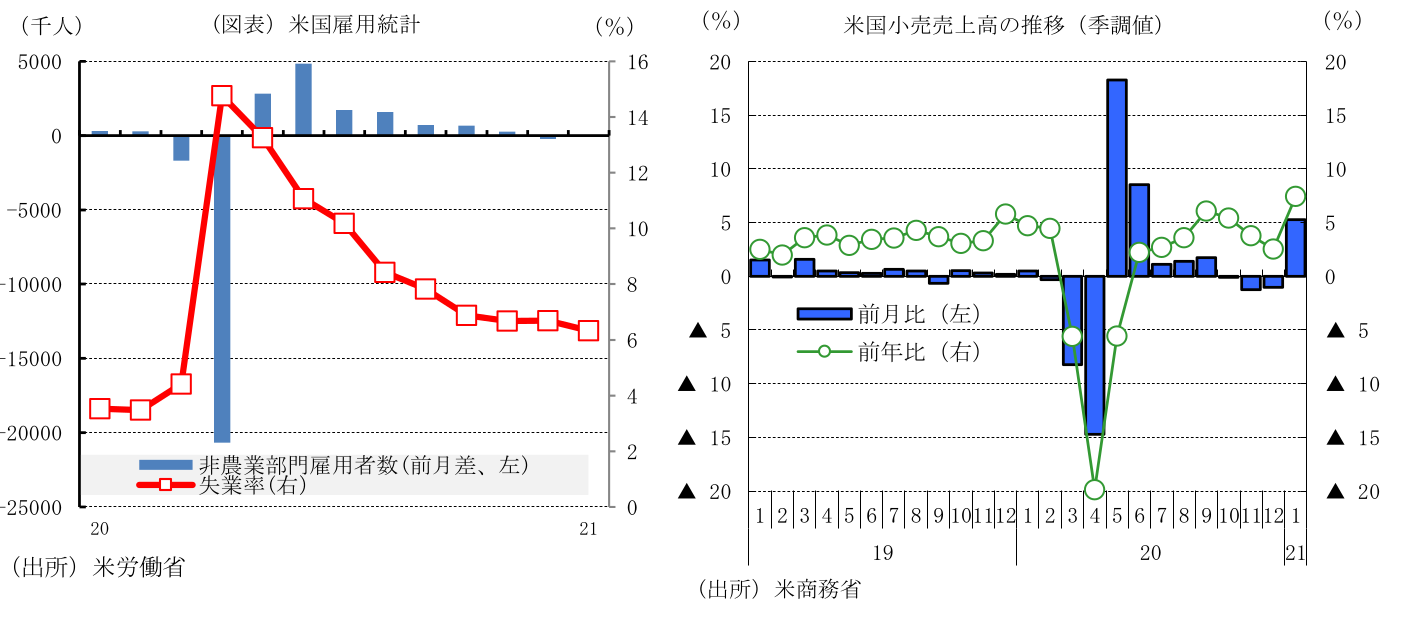 もっとも、個人消費の動向を示す小売売上高が、経済支援策による所得の増加などを受け、1月に急拡大に転じた。また、企業の景況感を示すISM景気指数は、製造業、非製造業ともに21年1月にかけて高い水準を維持しており、景気回復ペースの再加速が示唆されている。一方、労働市場では、新型コロナウイルスの感染拡大第3波によって、非農業部門雇用者数が12月に減少に転じ、1月も小幅増加にとどまった。失業率は20年4月の14.7%(同統計作成開始以降で最悪の水準)をピークに21年1月に6.3%まで低下したものの、コロナ危機で失業し職探しを諦めた人を含めると10%程度となる。コロナ危機前との比較では、雇用の水準は大幅に下回り、失業率は高い水準にとどまっている。