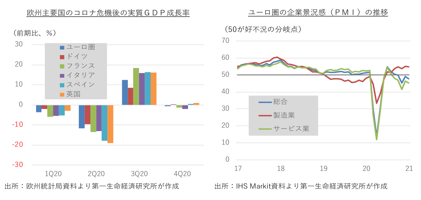 昨年秋の新型コロナウイルスの感染第二波の発生を受け、欧州各国では都市封鎖が再開され、経済活動にブレーキが掛かっている。行動制限解除で2020年7-9月期に大きくリバウンドした後、10-12月期のユーロ圏の実質GDP成長率は前期比▲0.6%、同年率▲2.4%とマイナス成長に再転落した。2020年の年間成長率は▲6.8%と、リーマン危機時の2009年(同▲4.5%)を上回り、史上最大の落ち込みを記録した。年明け以降も変異種の感染が広がっており、多くの国が行動制限の強化や延長を余儀なくされている。1-3月期のユーロ圏は再びマイナス成長となる可能性が高い。ただ、昨年春の第一波では経済活動が全面的に停止したのに対し、第二波の落ち込みは比較的軽微なものにとどまりそうだ。世界景気の回復期待を支えに、輸出関連を中心に製造業活動が上向いていることが、世界全体が悲観一色だった昨年春とは大きく異なる。在宅勤務環境の整備やウイルスに対する理解が深まったこともあり、経済活動と感染予防をある程度両立することができるようになった点も大きい。また、英国と欧州連合(EU)の間で自由貿易協定が締結され、企業を取り巻く不透明が払拭されたこと、ワクチン接種が開始されたこと、米国でバイデン政権が誕生したことも、先行きの回復期待を通じて景気の下支え役となっている。