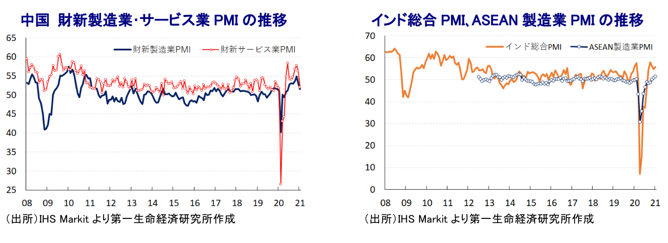 他方、中国以外のアジア新興国においては、徹底した感染対策により事態収束が図られた台湾及びベトナムでは経済活動の正常化が進んだほか、世界経済の回復の動きも相俟って景気の底入れが進んでおり、両国の昨年の経済成長率は中国と同様にプラス成長を維持するなど、マクロ面で新型コロナウイルスの影響を克服したと捉えることが出来る。また、シンガポールについても感染収束が図られたことで経済活動の正常化が進められているものの、経済構造面で輸出依存度が極めて高いために世界経済の動向に揺さぶられやすい状況は変わっていない。さらに、一部の国では感染が再拡大したことで行動制限の再強化に追い込まれる動きがみられるものの、多くの国では感染拡大の動きが一服していることを受けて経済活動の再開に舵を切る動きが広がっているほか、すべての国で財政及び金融政策を総動員する形で景気下支えを図る動きもみられる。そして、世界経済の回復を追い風にアジア新興国内における貿易取引は底入れの動きを強めており、各国の外需を取り巻く環境が改善していることも相俟って企業マインドは改善傾向を強めるなど景気の底入れを示唆する動きもみられる。その意味では、多くのアジア新興国はすでに『最悪期』を過ぎていると捉えることが出来るものの、国ごとに新型コロナウイルスを巡る状況にバラつきが生じている上、そのことが経済活動を巡る不透明要因となっていることを勘案すれば、依然として新型コロナウイルスの影響の真っ只中にあると捉えることが出来よう。