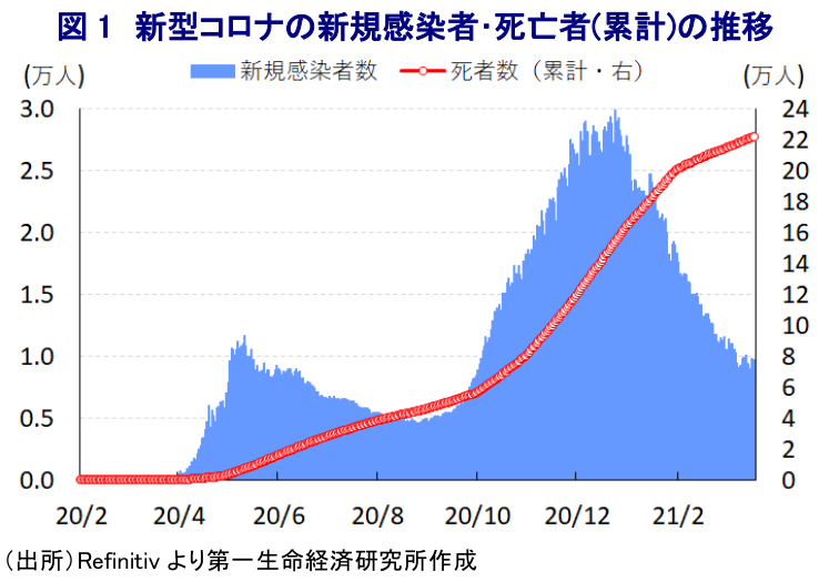 ロシアでは、昨年末にかけて新型コロナウイルス(SARS-CoV-2)が再拡大する『第2波』に見舞われる事態となったものの、昨春の感染拡大の『第1波』に際して感染封じ込めを目的とする外出禁止令といった強力な行動制限が課された結果、深刻な景気減速に直面するなどここ数年の国際原油価格の低迷長期化も相俟って経済への悪影響が顕在化したため、政府は再度の行動制限に対して及び腰の対応をみせてきた。 他方、同国では積極的にワクチン開発が進んで昨夏には世界で初めてワクチンが認可されるなどの動きがみられたほか、昨年末以降はワクチン接種が開始されている。足下における累計の感染者数は445万人弱と米国、ブラジル、インドに次ぐ上、死亡者数も22万人強と米国、ブラジルに次ぐ水準にあるものの、新規感染者数は昨年末を境にピークアウトしているほか、死亡者数の拡大ペースも鈍化するなど状況は改善に向かう兆候がうかがえる。