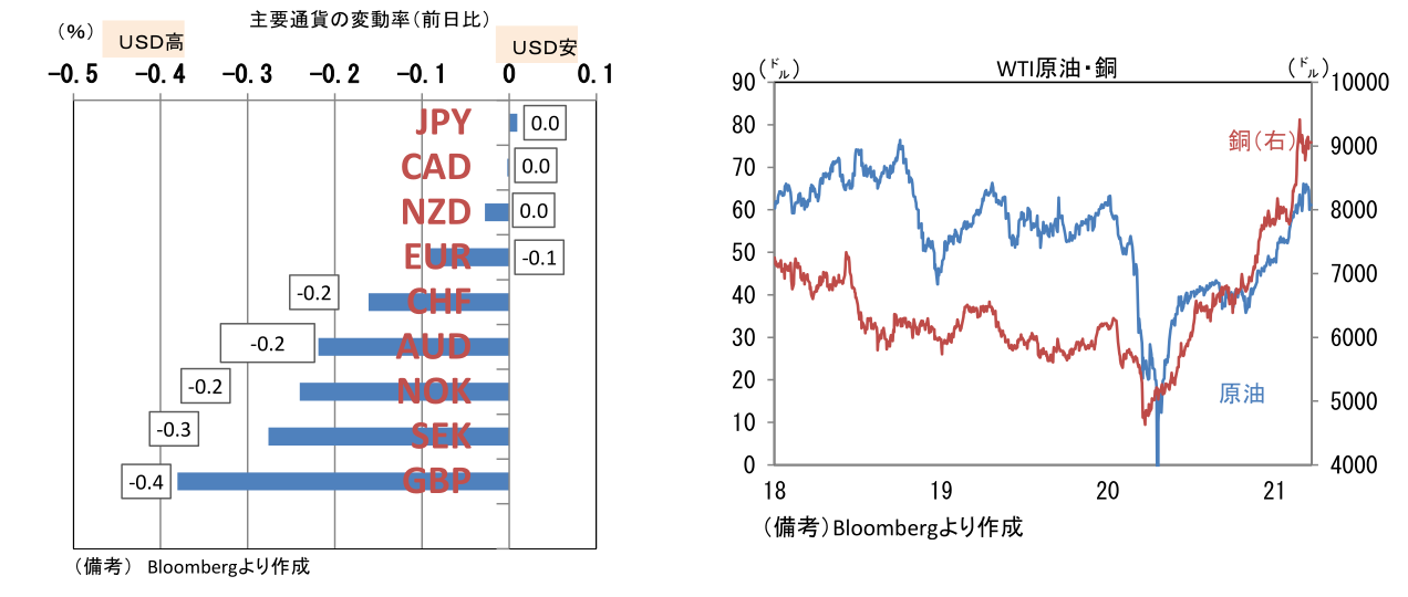 - 為替(G10通貨)はUSDがやや強め。USD/JPYは109近傍で一進一退も、EUR/USDは1.19前半へと低下。コモディティはWTI原油が61.4㌦(+1.4㌦)へと上昇し、銅も9057.0㌦(+1.5㌦)へと上昇。金は1741.7㌦(+9.2㌦)へと上昇。安全資産「金」と景気の強さを反映する「銅」の相対価格は低下。ビットコインは週末を通じてやや軟調。