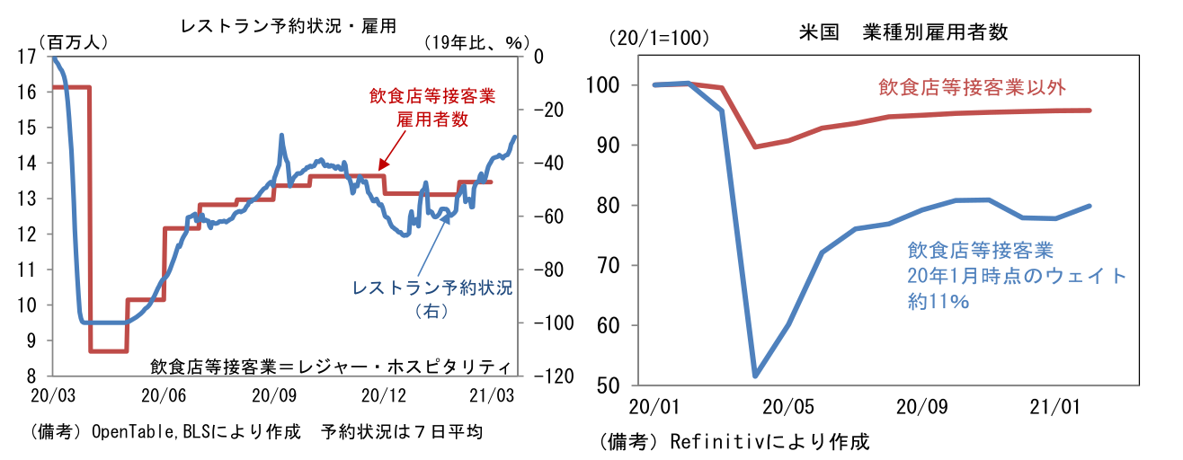 - 金融市場のインパクトという点では、上記よりもここ最近の米指標が重要だろう。速報性に優れたデータは3月の米経済回復を強く示唆している。筆者が注目するレストラン予約状況は、これまでコロナの打撃が集中していた飲食店が3月に入ってから急速に息を吹き返しつつある様子が示されている。最新値である3月20日の予約件数は2019年対比で2割減のレベルまで戻しており、この数値は飲食店等接客業(レジャー・ホスピタリティ、20年1月時点で全雇用者に占めるウェイトは約11%)の雇用回復を意味していると考えられる。労働集約的な飲食店等接客業は、客足の回復が雇用増加に結びつき易いことを踏まえると、3・4月の雇用統計はかなり明るい結果になりそうだ(雇用統計調査週は12日を含む週)。