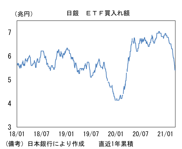 - なお、直近1年のETF買い入れペースは既に6兆円を明確に下回っており、買い入れ基準を厳しく変更した(とみられる)2月以降でみれば年間の買い入れペースは2兆円すら大幅に下回っている。新たな買入れ基準とみられるTOPIX前場下落率1%超が発生する日は、2015-20年の平均で26営業日程度であるから、そこに最近の1回(1日)あたり買い入れ額である500億円を当てはめると1.3兆円にしかならない。設備・人材ETF3000億円を加えても、1.6兆円であるから日銀は既に6兆円を放棄していたことになる。