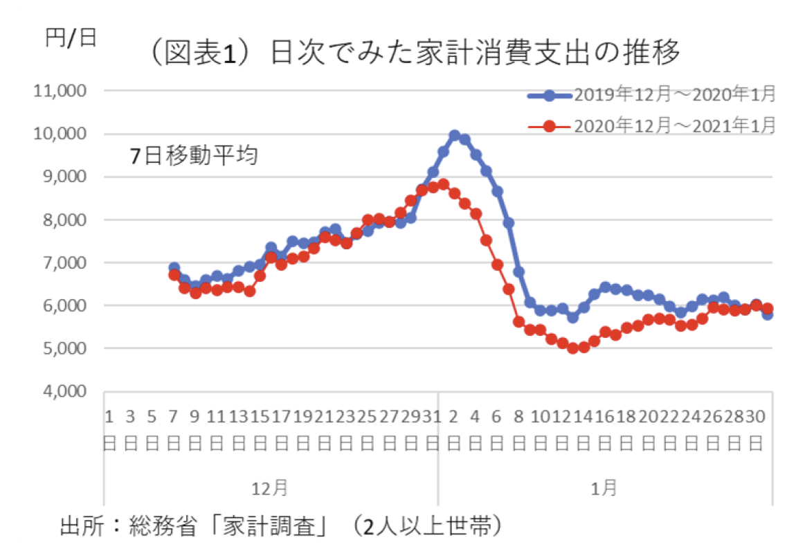 この緊急事態宣言の効果がどのくらいかは、政策当局者がきちんと整理しておくべきだ。筆者も、公開されている総務省「家計調査」の日次データから、1月8日~31日までの期間にどのくらいの消費の変化があったのかを分析してみた。消費の変化が、生活者の活動量をそのまま反映しているという考え方だ。