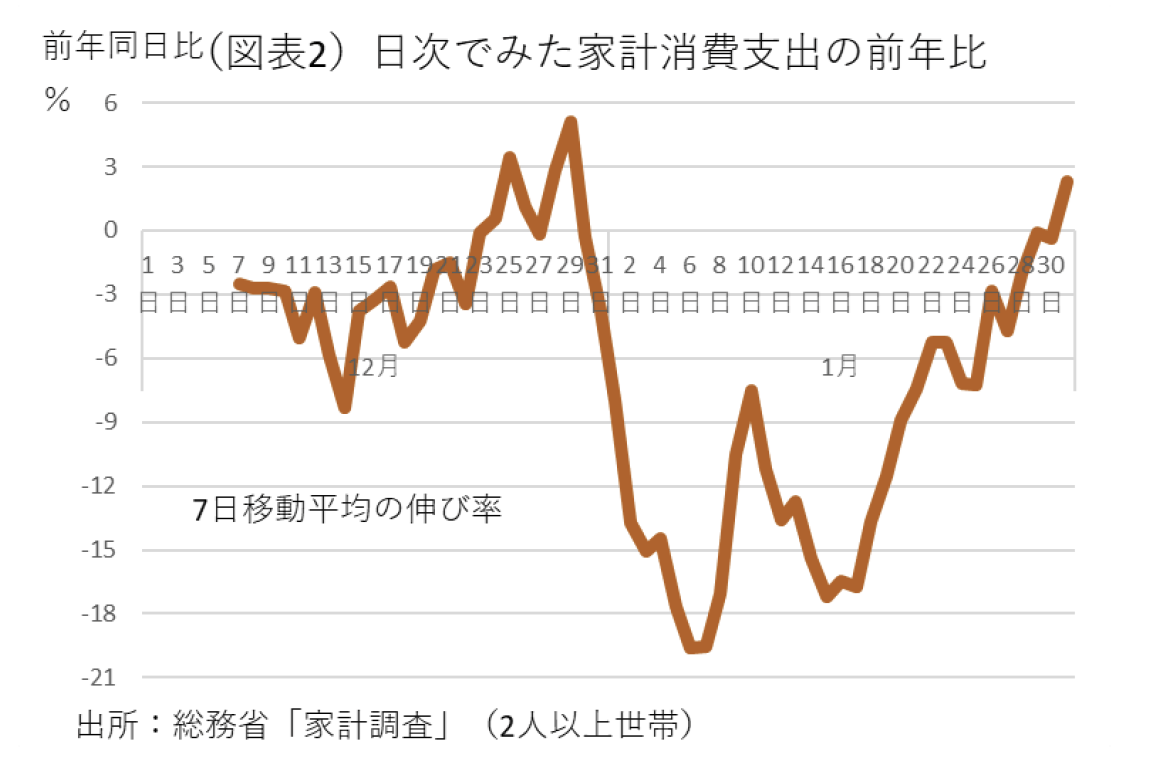 参照するのは、2020年12月1日から2021年3月31日までの日次データを7週間移動平均して、曜日ごとの変動を消したものだ(図表1)。これを前年の同期間と比べて、前年比伸び率を計算してみた(図表2)。すると、家計は2021年1月7日に緊急事態宣言が発令される手前から消費を抑制していた。特に、1月中旬まで大きく消費を減らしていたことがわかった。消費が大きく減り始めたのは、12月末頃からだ。これは、感染拡大が進んで、政府が12月28日以降のGoToキャンペーンを停止した時期と重なる。当時、正月休みの帰省・旅行を止めることが、政府・自治体から呼びかけられていた。1月4日には、菅義偉首相が記者会見を行って、緊急事態宣言の検討を語った。1月7日には、緊急事態宣言の再発令を宣言した。この時期が最も消費が落ち込んだ時期だ。