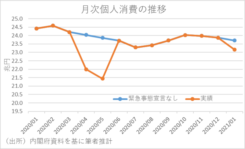 過去の緊急事態宣言発出に伴う外出自粛強化により、最も悪影響を受けたのが個人消費である。そして、実際に過去のGDPにおける個人消費と消費総合指数に基づけば、2020年4~5月にかけての個人消費は、緊急事態宣言がなかった場合を想定すれば、▲4.5兆円程度下振れしたと試算される。