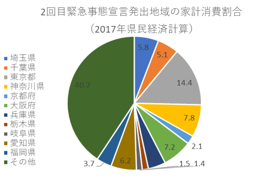 そこで、今回のまん防発出の影響を試算すべく、直近2017年の県民経済計算を基に、家計消費の全国に占める発出地域の割合を算出すると、宮城県1.7%+大阪府7.8%+兵庫県4.2%=13.1%となる。