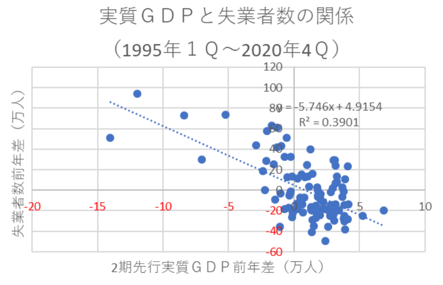 また、近年のGDPと失業者数との関係に基づけば、実質GDPが1兆円減ると2四半期後の失業者数が+5.7万人以上増える関係がある。従って、この関係に基づけば、3府県でまん防が1か月発出されれば、それに伴う半年後の失業者の増加規模は+0.4万人程度と試算される。