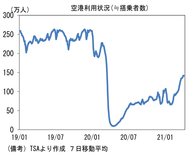- 米3月ISM非製造業景況指数は63.7へと大幅改善。1997年の集計開始以来の最高を更新。事業活動(55.5→69.4)、新規受注(51.9→67.2)が大幅に改善したほか、雇用(52.7→57.2)も伸びを高め、サプライヤー納期(60.8→61.0)も高水準維持。全18業種が業況改善を報告。ワクチン接種の進展に伴い飲食店を中心に営業が再開され、レストラン予約状況は19年比で8割程度まで回復した。旅行需要も復調。旅客数は19年比で6割程度に過ぎないものの、3月下旬以降は急速に回復力を増している。小売業など消費者を相手にする業種は、給付金効果の恩恵から好調を維持したとみられる。
