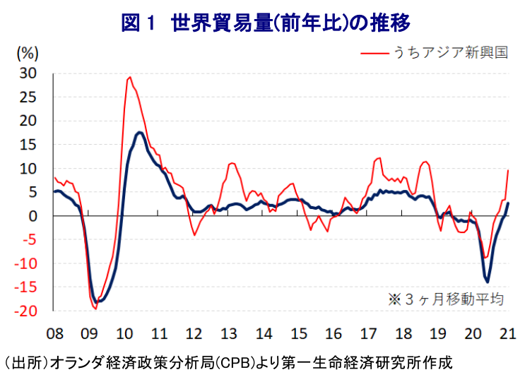 - 昨年のアジア新興国は新型コロナウイルスの影響を受けて、内・外需双方で深刻な景気減速に直面した。しかし、世界的な経済活動の再開の動きに加え、財政及び金融政策を通じた景気下支え策を受けて景気は底入れしている。アジア新興国は経済の輸出依存度が相対的に高い上、足下では域内貿易が世界を上回るペースで加速していることも重なり、アジア新興国は早いペースで景気回復の動きを強めていると言えよう。
