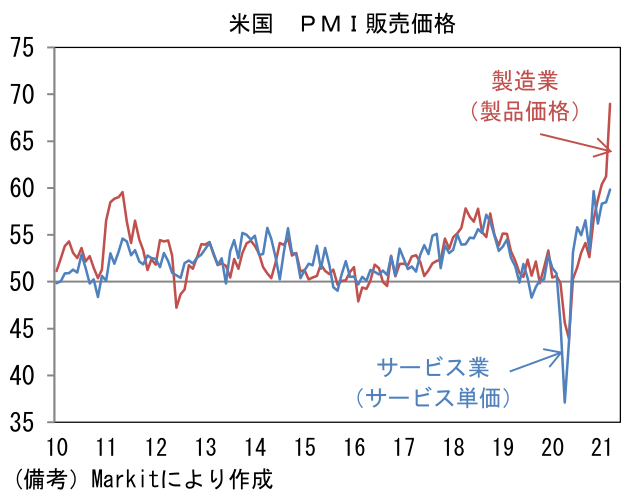 - 13日(火)発表の3月米CPIは金融市場の注目を集めそうだ。総合CPIは前月比+0.5%、前年比+2.5%へと上昇加速が予想されている。エネルギー価格が上昇基調を強めるなか、耐久消費財を中心に財価格の上昇持続が予想される。前年比伸び率は20年3月に落ち込んだ“裏”によって大幅に加速する見込み。コアCPIは前月比+0.2%、前年比+1.5%と比較的緩やかな上昇に留まるものの、前年の裏要因が強く発現する4月には2%近傍へと伸びを高めると予想される。