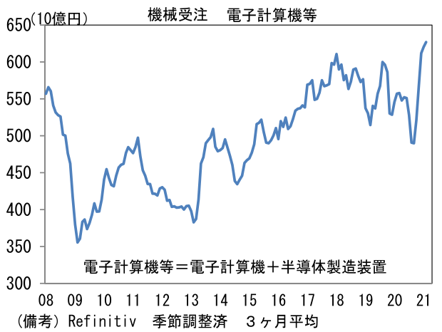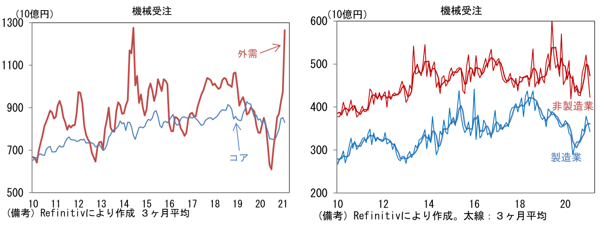- 他方、資本財輸出の先行指標である「外需」は前月比+76.2%とスパイク。3ヶ月でも+29.8%と大幅増加。中国、米国における自動車販売の強さ、世界的な半導体需要の強さが背景にある。