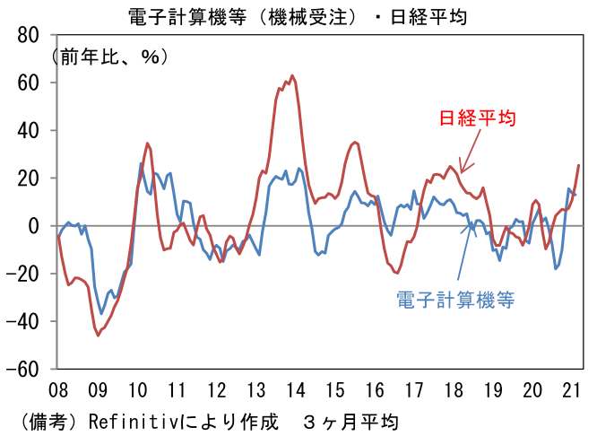 - 株式市場との関連が深い「電子計算機等」は前月比▲2.8%と2ヶ月連続マイナスも、3ヶ月平均では+1.1%と5ヶ月連続の増加。水準は前サイクルのピークを上回り、IT関連財需要の強さを物語っている。「電子計算機等」の大部分を占める半導体製造装置の引き合いが強く、特に海外向けの伸びが著しい。この指標は日経平均株価との連動性が強いだけに、受注好調は心強い。