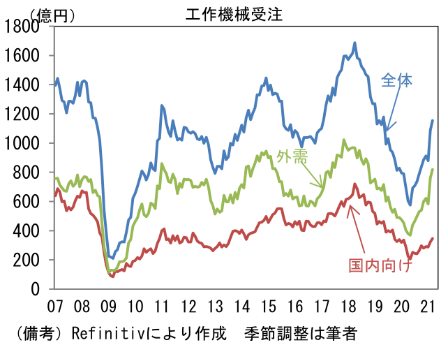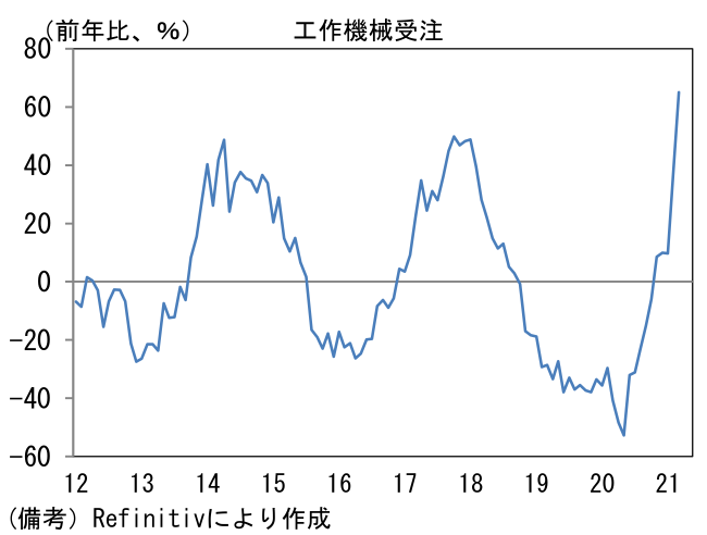 - 3月工作機械受注は前年比+65.0%へと伸びを高めた。国内向けが+18.7%と、2018年11月以来の前年比プラス。外需は+101.8%へと急増。筆者作成の季節調整値では全体が前月比+6.1%、国内向けが+7.6%、外需が+7.6%であった。業種・地域別詳細は確報を待つ必要があるが、これまでの傾向から判断して中国、米国、アジア向けが伸びたとみられる。