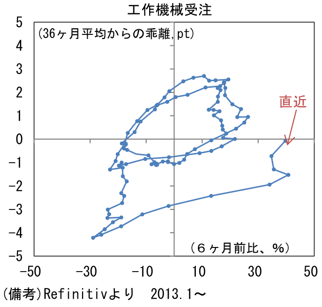 - サイクルの位置取りを確認するために、縦軸に工作機械受注の水準(36ヶ月平均からの乖離)、横軸に方向感(6ヶ月前比)をとった循環図をみると、現在は右下領域を上方向に進んでおり、20年央に底打ちした様子が見て取れる。過去のサイクルに従うなら、今後は回復モメンタムをやや弱めつつも水準を切り上げていくと予想される。