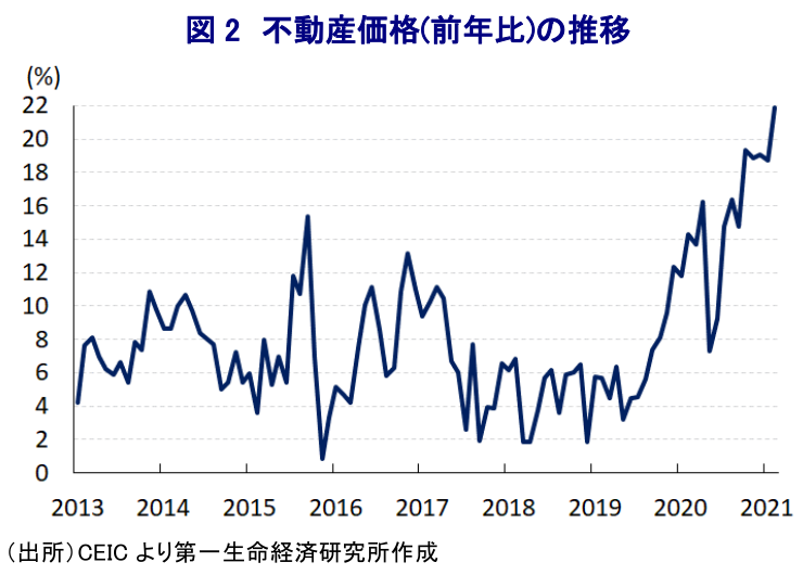 ニュージーランドにおいては、昨年来の新型コロナウイルス(SARS-CoV-2)のパンデミック(世界的大流行)を受けて同国内でも感染拡大の動きが広がり、感染封じ込めを目的とする海外からの入国制限のほか、全土を対象とする外出制限を実施するなど強力な行動制限が採られた。その後の新規感染者数は度々増加したほか、2月には最大都市オークランドにおいて市中感染が確認されて行動制限が再強化されるなど動きもみられたものの、強力な感染対策が奏功して年明け以降における1日当たりの新規感染者数は多くても30人未満で推移しており、2月半ば以降の死亡者数もゼロで推移する展開が続いている。結果、足下における累計の感染者数は2,600人弱、死亡者数も26人に留まるなど主要先進国の間で最も感染対策に成功した国のひとつと捉えられる。隣国の豪州も同様に感染封じ込めが進んでいることを受けて、今月19日からは両国間で出入国制限が緩和されて隔離なしで双方を往来出来るようになるなど、徐々に幅広い経済活動で正常化に向けた取り組みが前進する。また、オークランドで再強化された行動制限についても、その後は市中感染が確認されないことを受けて段階的に緩和されており、景気の底入れに繋がることが期待される。なお、上述のように感染封じ込めが進んでいることから、同国経済は景気の底入れが進んでいるとみられたものの、昨年10-12月の実質GDP成長率は2四半期ぶりのマイナス成長となるなど、早くも踊り場を迎えていることが確認されている 1。事実、企業マインドの動きをみても、世界経済の回復などを背景に製造業は比較的堅調な推移をみせる一方、行動制限の再強化などが足かせとなる形でサービス業は調整局面が続く対照的な動きが続いてきたなか、経済活動の正常化が進むことで改善の動きを強めることが期待される。他方、景気下支えに向けて中銀は大胆な利下げに加えて量的緩和政策を実施するなど、異例の金融緩和に動いていることを受けて同国金融市場は『カネ余り』の様相を強めており、昨年半ば以降は不動産市場への資金流入の動きが強まった結果、足下の不動産価格は急上昇するなど『バブル化』が懸念されている。こうした事態を受けて、中銀は2月に住宅ローンに対するLVR(ローン資産価値比率)規制を4月から復活させるほか、5月以降は投資目的の住宅ローンを対象に規制を一段と厳格化することを決定するなどの動きをみせている2 。さらに、政府も先月に投資家を対象にした税制措置(税回避に必要となる住宅保有期間の倍化(5年→10年)、住宅ローンの金利支払いを費用計上して家賃収入と相殺する措置の廃止)に加え、38億NZドル(GDP比1.2%)規模の新基金を創設してアーダーン政権が『目玉政策』としてきた低価格住宅の供給を通じた不動産開発計画(Kiwi Build)を推進する考えを表明している。このように、中銀及び政府は景気下支えの一方で不動産バブル懸念に対応せざるを得ない『板挟み』状態に置かれている。