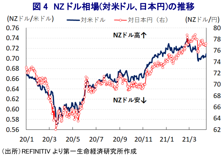 なお、中銀は昨年来、利下げや量的緩和政策に動くとともに、昨年末には低金利政策を長期に亘って維持する考えを強調することにより、中銀の政策目的に規定されている物価安定と雇用最大化の実現を通じて景気下支えを図る方針を示してきた3 。他方、年明け以降の金融市場においては、中銀が早期に金融政策の正常化に動く必要に迫られるとの見方を反映して長期金利が上昇する動きをみせたことを受けて、中銀は2月の定例会合において現行の金融緩和の維持を決定するとともに、長期に亘って金融緩和を継続する方針を強調する姿勢をみせた4 。中銀によるこうした姿勢に加え、同国経済が踊り場を迎えていることが明らかになったことを受けて上昇の動きは一服しており、足下の長期金利の水準は『新型コロナ禍』前をうかがう程度となるなど落ち着きを取り戻している。こうしたなか、中銀は14日に開催した定例会合において政策金利を0.25%、大規模資産買い入れ策(LSAP)の規模も1,000億NZドルで据え置き、融資資金調達プログラム(FLP)も維持するなど現行の金融緩和を維持するとともに「金融緩和を継続する」との認識を改めて強調した。会合後に公表された声明文では、世界経済について「2月の前回会合以降改善が続いており、財政及び金融政策が回復を支えているが、不確実性は高く国ごとに差異が生じている」との認識を示す一方で「一次産品価格は堅調な世界需要の恩恵を受けている」との見方を示した。一方、同国経済については「国内消費は回復した後に夏場にかけて減速しており、短期的なデータは引き続き大きく変動している」ものの、「隣国豪州との往来正常化は観光関連産業の下支えに資する一方、政府による住宅政策の効果や物価及び雇用に与える影響の確認には時間を要する」との見方を示した。その上で「中期的な景気見通しは2月の前回会合の際に示したシナリオにほぼ沿っている」との見通しを示す一方、「見通しは引き続き感染動向や企業及び家計部門のマインドなどによって大きく左右されるなど依然として非常に不確実である」との認識を示した。一方で物価動向については「世界的なサプライチェーンの混乱や国際原油価格の上昇など一時的な要因によって押し上げられている」としつつ、「金融緩和が長期に維持されなければ中期的な物価動向及び雇用は目標を下回る可能性高いと見込まれる」との認識を示すなど、引き続き足下の金融緩和の長期化が必要との考えを示した。そして、「インフレ率を目標の中央値(2%)で安定するとともに雇用が最大限持続可能な水準以上になると確信出来るまで、現在の刺激的な金融政策を維持する」と改めて示すとともに、「こうした条件を満たすには相当な時間と忍耐が必要になる」との姿勢を示した上で「必要に応じて政策金利を引き下げる用意がある」とするなど、追加緩和にも含みを持たせる姿勢をみせた。このところの通貨NZドル相場を巡っては、中銀による金融政策の正常化期待が後退していることも影響して米ドルに対しては上値の重い展開をみせる一方、日本円に対しては底堅い動きが続く対照的な状況にあるが、しばらくは同様の展開が続く可能性が高いと見込まれる。