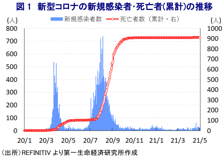 - 豪州は主要国のなかで新型コロナウイルス対策に成功した国のひとつとなっている。ただし、国境封鎖の長期化は観光関連産業の足かせとなっているが、政府は早期の国境封鎖の解除に後ろ向きである。他方、ワクチン接種は計画の後ろ倒しを余儀なくされるなか、市中感染リスクもくすぶり対策の手綱は緩められない。