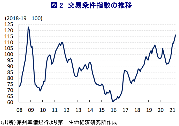 なお、感染収束による行動制限の緩和を受けて経済活動の正常化が進むなか、政府及び中銀(豪州準備銀行)は財政及び金融政策を総動員して景気下支えに取り組んでいることもあり同国経済は新型コロナウイルスのパンデミックによる悪影響を克服している一方、金融市場においては『カネ余り』を背景に不動産価格は上昇傾向を強めるなどバブル化が懸念されている。この背景には、金融市場においては景気回復を受けて長期金利が上昇している一方、中銀は景気回復に冷や水を浴びせることを警戒して緩和政策を長期的に堅持する姿勢を示しており 1、低金利環境の長期化が期待されるなかで生活様式の変容を受けて住宅需要が押し上げられており、不動産の需給がひっ迫していることも市況の過熱感を招いている。また、世界経済の回復期待を背景とする国際商品市況の底入れを反映して、足下の交易条件指数は一段と上昇傾向を強めるなど景気の押し上げに繋がることが期待されており、金融市場では中銀が早晩金融引き締めの実施を迫られるとの見方が出ている。ただし、そうした見方を反映して通貨豪ドル相場は底堅い推移が続いており、豪ドル高は景気回復に冷や水を浴びせる懸念に繋がることから、当局は難しい対応を迫られる事態に直面している。こうしたなか、中銀は4日に開催した定例の金融政策委員会において政策金利、3年物国債金利の誘導目標、ターム物資金調達ファシリティー(TFF)の適用金利をいずれも0.10%に据え置くとともに、量的緩和政策も維持する決定を行った。会合後に公表された声明文では、世界経済について「来年にかけて力強い回復が見込まれるが、回復には依然としてバラつきがある」との認識を示す一方、国際金融市場について「国債金利は年初にかけて上昇したが、足下では堅調に推移している」など落ち着きを取り戻しているとの見方を示した。同国経済については「想定を上回る回復が続き、今後も雇用の回復が見込まれる」とした上で、経済見通しについて「今年は+4.75%、来年は+3.5%になると見込まれる」と2月会合時点に示した見通し 2を上方改定している。ただし、景気回復にも拘らず物価に下押し圧力が掛かっているとして、インフレ見通しは「今年は+1.5%、来年は+2%になると見込まれる」として、長期に亘ってインフレ目標を下回る展開が続くとの見通しを示している。他方、不動産市況については「すべての主要市場で上昇しており、住宅ローンの動向を注視しつつ貸出基準を維持することが重要」との認識を示している。なお、先行きの政策運営を巡っては「7月の定例会合では、金利目標は変更しないものの、3年物国債の対象を変更するか否かを検討する」ほか、「2回目の1000億豪ドル規模の国債購入プログラムの完了後の動向についても検討する」としつつ、「完全雇用と物価目標の実現に向けて追加的な国債購入を行う用意がある」として完全雇用の実現に向けて追加緩和の可能性に含みを持たせている。その上で、「インフレ率が持続的に2~3%の目標に入るまでは政策金利を引き上げない」との姿勢を改めて強調したで、「その実現には労働需給のタイト化による賃金上昇が必要」とし、その実現は「早くても2024年になる」と改めて向こう3年近くに亘って現行の緩和姿勢を維持する姿勢をみせた。