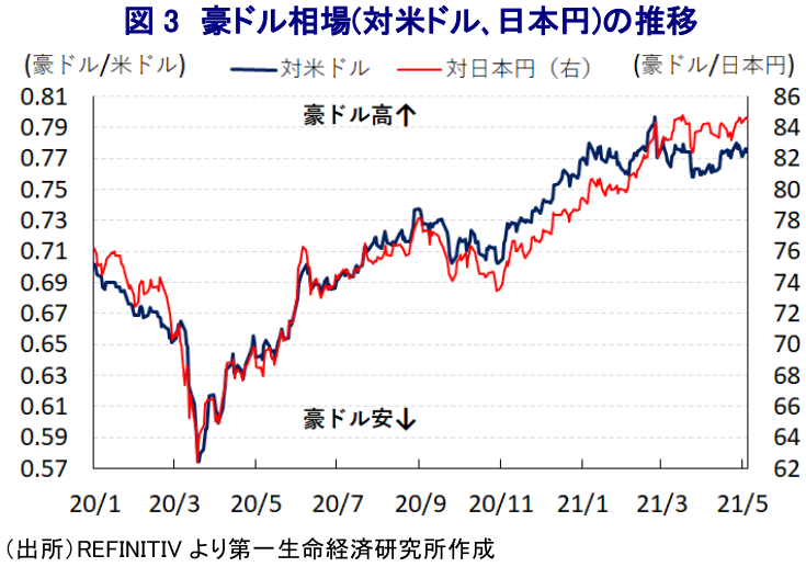 中銀は、過去数ヶ月に亘って現行の緩和姿勢を長期に亘って維持する姿勢を強調しているものの、上述のように景気回復に繋がる材料が色々と出ている上、不動産市況のバブル化が懸念されるなかで早晩金融引き締めに追い込まれるとの見方を反映して長期金利は依然として高止まりしている。国際金融市場においては、米長期金利が頭打ちしていることを受けて米ドル相場も頭打ちする展開が続いているなか、豪ドル相場については引き続き底堅い動きが見込まれるほか、日本円に対しては一段と強含むことも考えられよう。