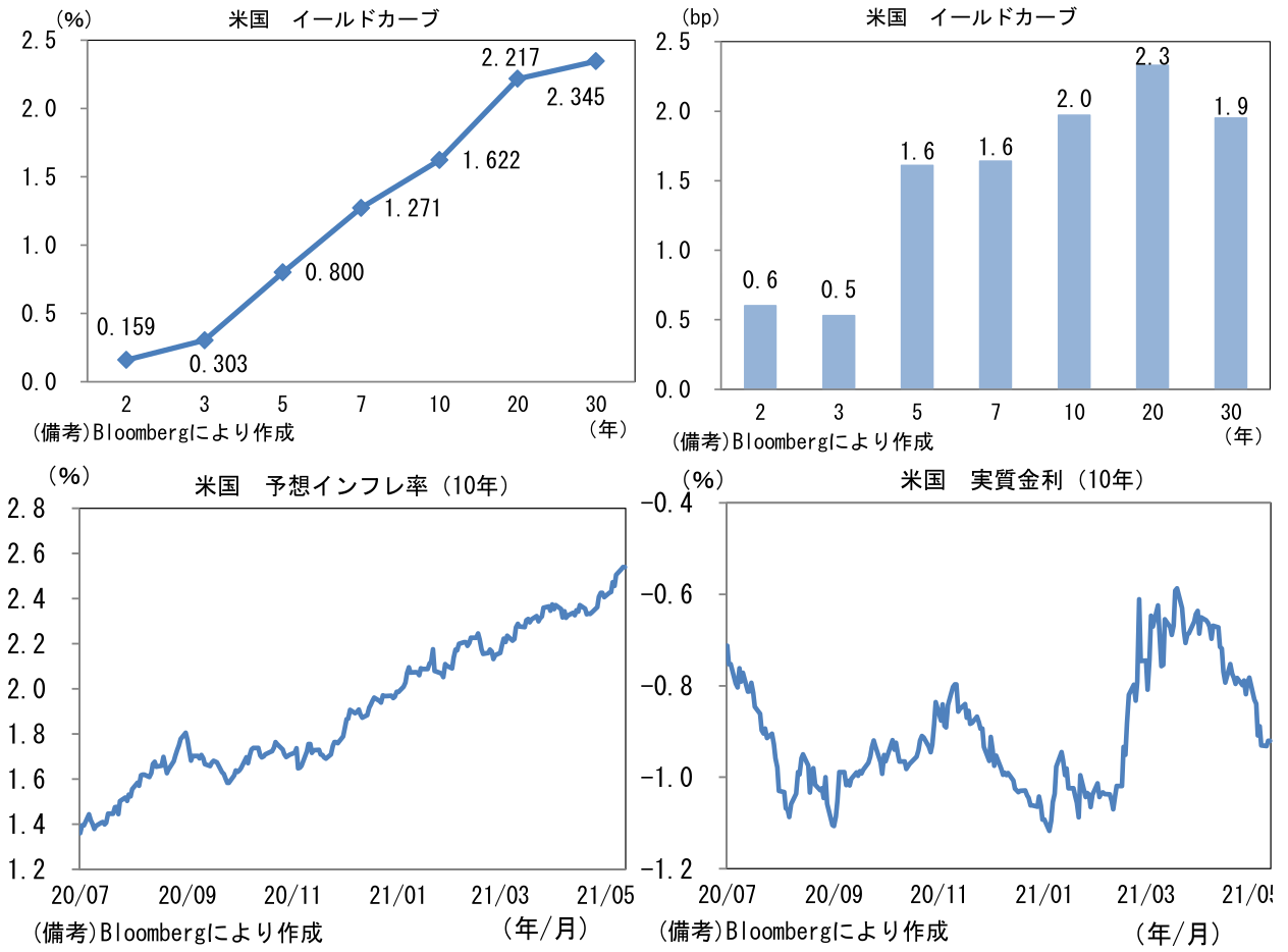 - 米金利カーブはベア・スティープ化。予想インフレ率(10年BEI)は2.540%(+0.9bp)へと上昇し、パンデミック発生後の最高を更新。債券市場の実質金利は▲0.921%(+1.1bp)へと上昇した。