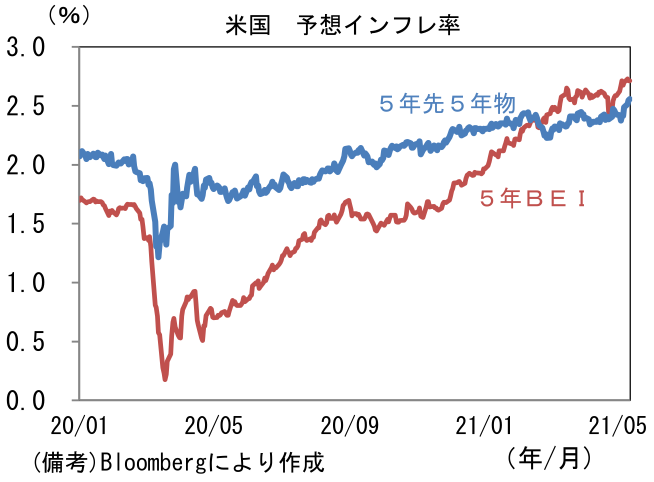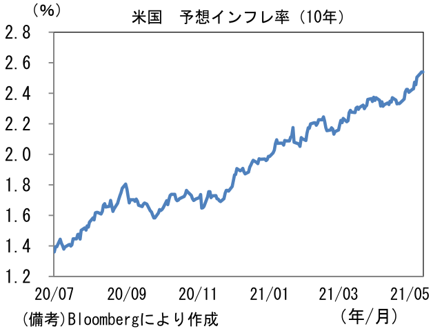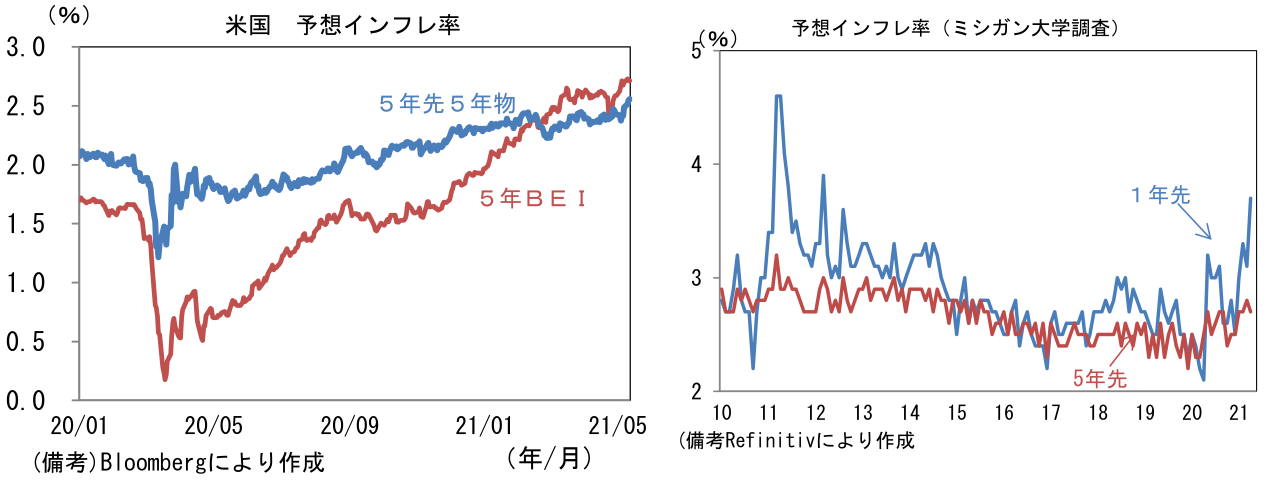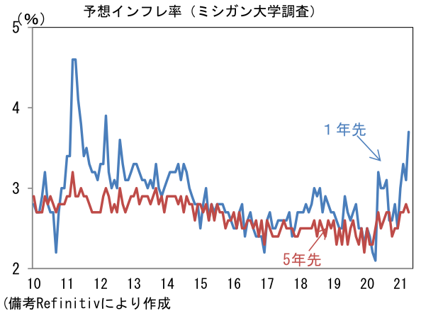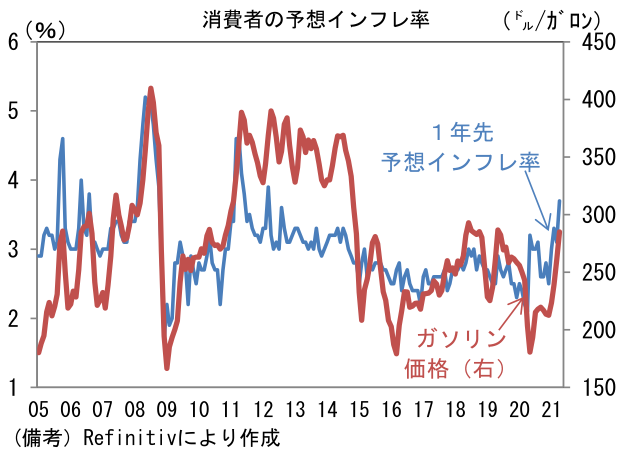 - 足もとでは債券市場の予想インフレ率のほか、企業サーベイで「価格」に関する項目が異例の高水準に上昇し、またガソリン価格上昇もあって消費者の予想インフレ率も顕著に上向くなど、インフレが大きなテーマになっている。