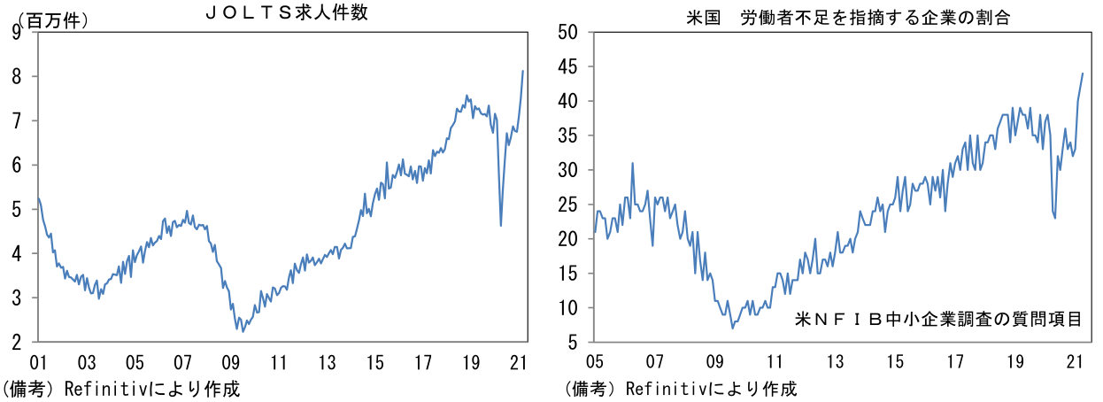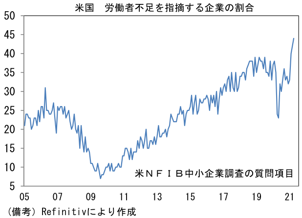 - なお、金融市場でさほど材料視されていない指標だが、昨日発表された3月求人件数と4月NFIB中小企業調査は、少なくとも短期的に賃金上昇圧力が高まる可能性を示唆した。前者は求人件数が過去最高を更新。後者は調査項目のうち「労働者不足を指摘する企業の割合」が一段と上昇し、レイオフ・解雇した従業員の呼び戻しに苦労している様子が映し出された。失業給付よりも魅力的な待遇を提示せねば採用が進まないケースもあるのではないか。