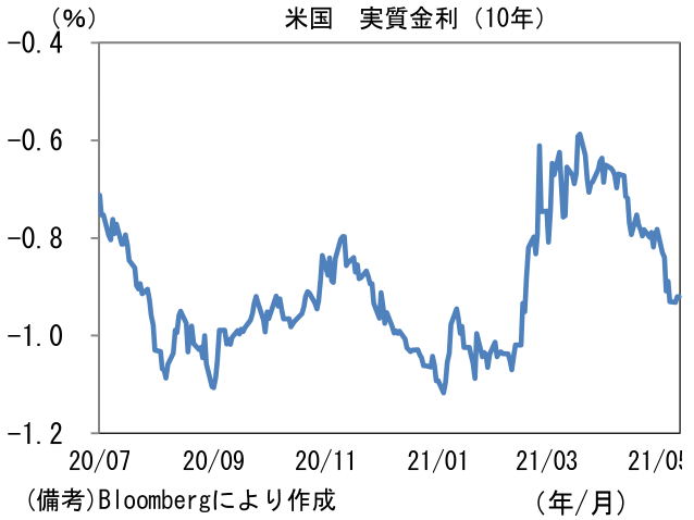 - その点、今晩発表のCPIは要注目。総合CPIは前年比+3.6%、コアは+2.3%と双方ともベースエフェクトによって上昇加速が予想されている。前月比の予想中央値は総合が+0.2%、コアが+0.3%となっている。金融市場でインフレがテーマになっている以上、市場予想を上振れた場合は金利上昇イベントになりそうだが、3月分が発表された4月13日は直前に積み上げられたショートポジション(米債売り)が巻き戻され、イールドカーブがブル・フラット化したという経緯があり、今回も反応を読むのは難しい。ただし、FEDが繰り返し指摘しているように物価上昇は「一時的」であることが市場参加者の共通認識になっていることを踏まえれば、中長期的なインフレの予想形成に大きな影響は与えることはないと思われる。